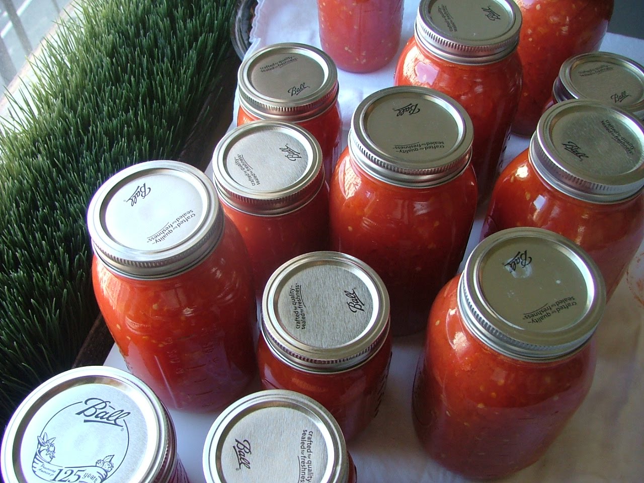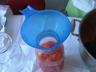 The funnel is important because it keeps the lip of the jar clean – necessary in order to seal them properly. If anything gets between the jar and its lid, it will not close up and make the much-anticipated “popping” sound that signals that all air is out of the jar and its contents are sealed for later use. Stevie had read that an acidifier was recommended in order to help preserve the tomatoes, bringing out their natural acidity, so I placed a tablespoon of lemon juice per pint on top of the tomatoes before we closed the jars. Then, we sat and waited, making sure that each and everyone popped, sometimes for an agonizing thirty minutes! At the end of the day, however, we succeeded, with about 10 and a half quarts put up.