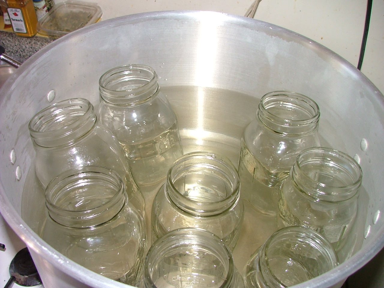 We began by sterilizing the jars. We filled Stevie’s extra large pot with water and placed the jars and their lids inside, then set it over high heat to come to a boil.