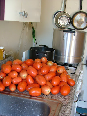 Yesterday, I woke up early, trucked it over to Stevie’s, then together we headed up to the McCarren Park farmers market to pick up 25 pounds of not-quite-ripe Roma tomatoes. Because we were buying so many, the farmer even gave us a discount: $1/lb., rather than the advertised $2. With trembling arms, we carried these home, then went back out to Brooklyn Kitchen to get quart and pint jars, as well as a wide-mouthed funnel.