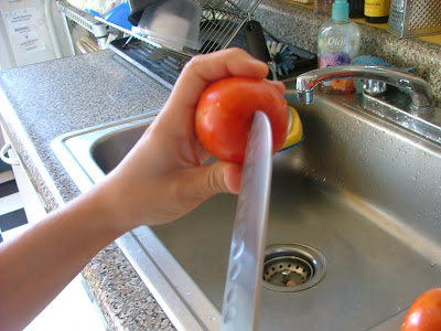 Then, we began to scrub the tomatoes to get all of the dirt off. Stevie put another pot of water on to boil. In the meantime, she scored the bottom of each tomato with an “x” to facilitate peeling later on.